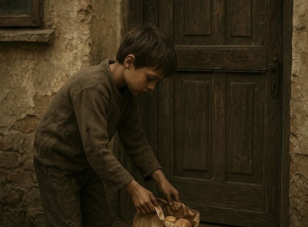 Martini nuk u ndal për të ngrënë. Ai nuk u ul në një stol, nuk e ndau atë me fëmijë të tjerë. Ai eci drejt një shtëpie të thjeshtë në fund të rrugës. Me kujdes, e vendosi qesen në pragun e derës… dhe iku me vrap, para se dikush ta shihte.