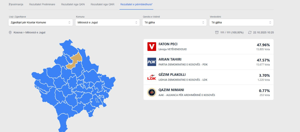 Bazuar në këto rezultate, Komuna e Mitrovicës parashihet që të shkoj përsëri në balotazh më 9 nëntor pasi që asnjëra parti nuk ka arritur të marr mbi 50% të votave, shkruan.