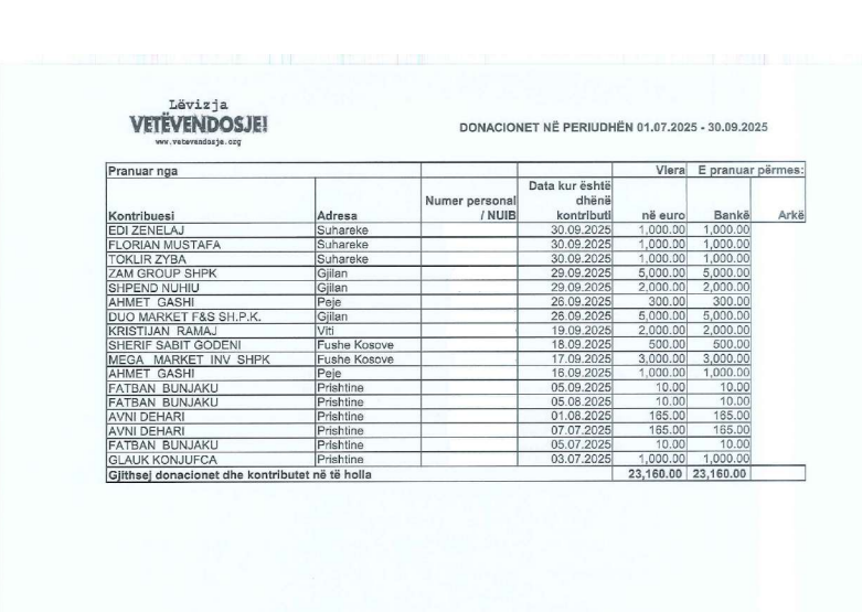 Gjatë këtyre tre muajve, VV ka pranuar 23 mijë e 160 euro. 1000 euro i ka dhuruar donacion Glauk Konjufca, Avni Dehari 330 euro ndërsa të tjerat nga persona jashtë partisë dhe që nuk kanë pozita në parti.
